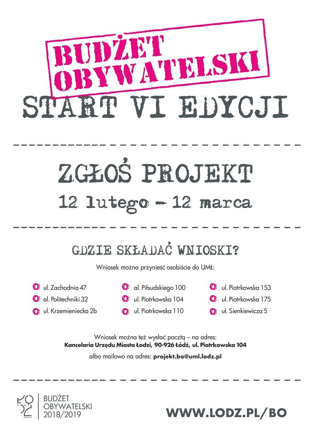 Wnioski z propozycją zadań można składać osobiście w 9 punktach Urzędu Miasta Łodzi (lista poniżej), drogą pocztową (na adres – Kancelaria Urzędu Miasta Łodzi, Piotrkowska 104, 90-926 Łódź) lub elektronicznie na adres projekt.bo@uml.lodz.pl.