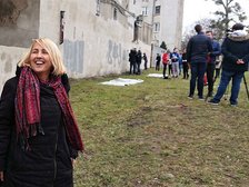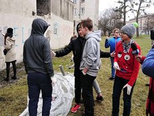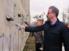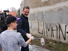 Symbolicznego zamalowania napisu szpecącego budynek przy ul. Oblęgorskiej 5 dokonali uczniowie Szkoły Podstawowej nr 111 w Łodzi w towarzystwie wiceprezydenta miasta, Krzysztofa Piątkowskiego, dyrektor Centrum Dialogu im. Marka Edelmana, Joanny Podolskiej oraz radnych.