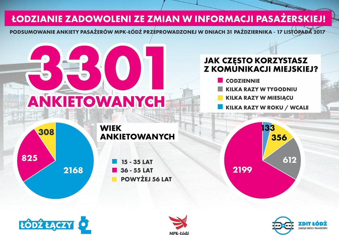 Ankietę skierowaną do pasażerów komunikacji miejskiej przeprowadzono w dniach 30 października - 17 listopada 2017 r. Pytano w niej o to, jak - po blisko pół roku od wprowadzenia zmian w zakresie informacji pasażerskiej - podróżni ocenili ich funkcjonowanie. Sonda dotyczyła trzech zasadniczych obszarów, czyli komunikatów głosowych, wyglądu wiat przystankowych oraz sposobu prezentacji rozkładów jazdy.