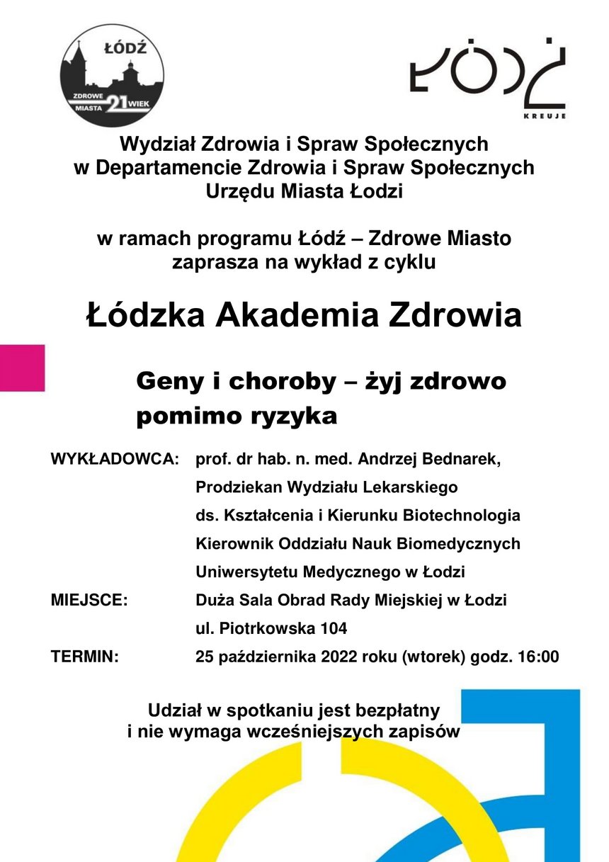 Wystąpienie "Geny i choroby – żyj zdrowo pomimo ryzyka" wygłosi p. prof. dr hab. n. med. Andrzej Bednarek, Prodziekan Wydziału Lekarskiego ds. Kształcenia i Kierunku Biotechnologia, Kierownik Oddziału Nauk Biomedycznych Uniwersytetu Medycznego w Łodzi.