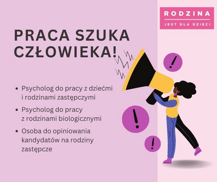 2. Do Wydziału Poradnictwa Rodzinnego i Pomocy Specjalistycznej szukamy psychologa z minimum rocznym doświadczeniem w pracy z rodziną. Jego zadaniem będzie współpraca i wspieranie rodzin biologicznych starających się o odzyskanie dzieci z pieczy.