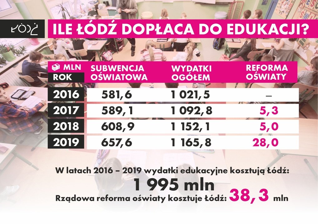 Rekordowa kwotę, bo aż 543,2 mln złotych z własnego budżetu samorząd dołożył do edukacji w 2018 roku. Na ten rok dopłata jest szacowana na ponad 508 mln zł, ale do grudnia ta kwota może jeszcze wzrosnąć. Odrębną pozycję po stronie wydatków stanowią koszty, bezkosztowej według byłej szefowej MEN Anny Zalewskiej, reformy edukacji. Dostosowanie szkół do potrzeb klas VII i VIII, zakup wyposażenia do klas, pomocy dydaktycznych, a także odprawy dla zwalnianych nauczycieli z gimnazjów pochłonie ponad 38 mln zł. Tylko w tym roku te koszty są szacowane na prawie 30 mln zł.