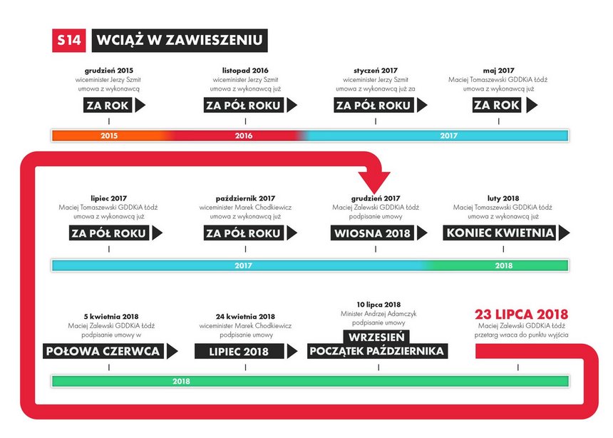 - Niepokojące jest to, że przedwczoraj podpisano umowę na realizację odcinka A1 od Tuszyna do Strykowa. Parę dni wcześniej w sprawie odcinka w województwie śląskim. Te wszystkie przetargi zostały ogłoszone w tym samym momencie – zarówno na A1 i S14. W przypadku S14 wracamy znów do grudnia 2017 roku. To efekt kombinowania z tym przetargiem – mówił Mateusz Walasek i przypomniał, że jest to już drugi przetarg.