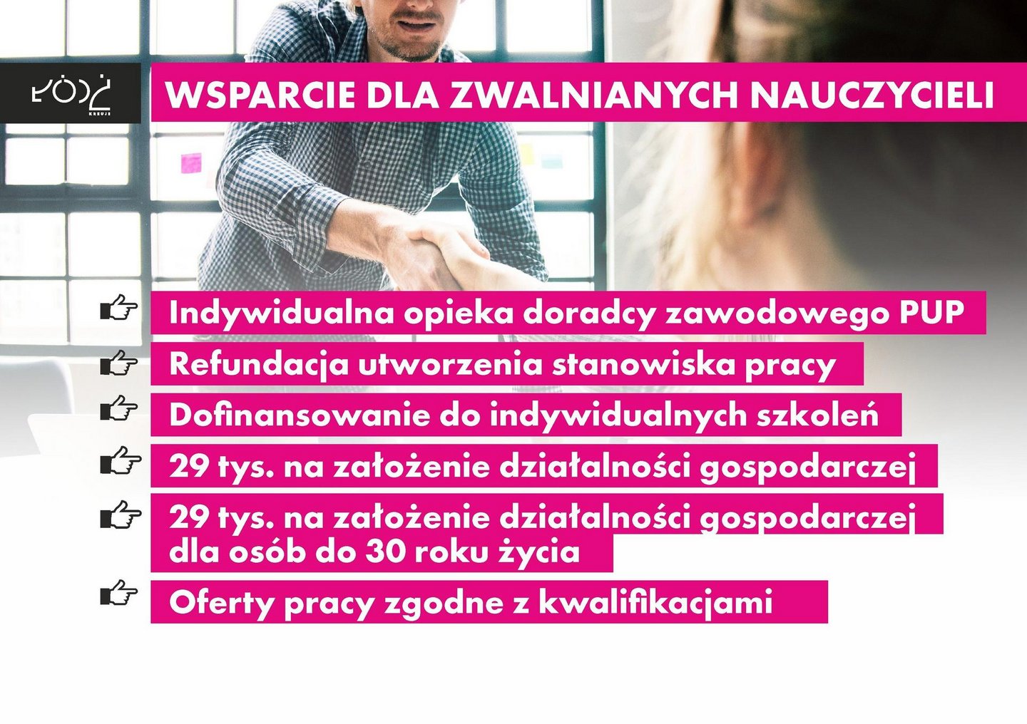 - Wspólnie z Urzędem Pracy przygotowaliśmy program pomocy dla zwalnianych nauczycieli, to konkretne wsparcie finansowe w postaci jednorazowej dotacji na rozpoczęcie działalności gospodarczej oraz na szkolenia pozwalające zdobyć nowe kwalifikacje. Zwolniony nauczyciel może otrzymać łącznie 40 tysięcy, dodam, że jest to pomoc bezzwrotna, o ile oczywiście będą spełnione określone warunki. Zapraszam zwalnianych do urzędu pracy, tam każdy będzie traktowany indywidualnie - powiedział Tomasz Trela, wiceprezydent Łodzi.