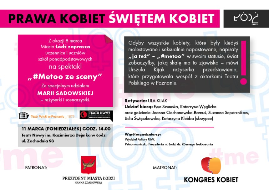 Z okazji Dnia Kobiet, Wydział Kultury UMŁ zaprasza do udziału w wydarzeniu szczególnie uczniów, uczennice i pedagogów, ale także wszystkich łodzian. Spektakl „Metoo ze sceny”, zainspirowany został globalnym ruchem #metoo, który znacząco wpłynął na rozwój społecznej świadomości przemocy wobec kobiet. Przez wydarzenie artystyczne, Wydział Kultury UMŁ pragnie uwrażliwić na poruszający problem molestowania, przekazać narzędzie do skutecznej obrony i asertywności. Po spektaklu, odbędzie się spotkanie, z reżyserką, która w swoich filmowych dziełach porusza tematykę kobiecą – Maria Sadowska opowie o pracy w branży filmowej i kinie kobiet, a także odpowie na pytania młodzieży.