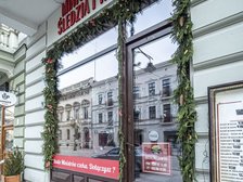 Kawiarnia Kraftowa, ul. Piotrkowska 48. Lokal ma piękną, w całości przeszkloną witrynę, w której świetnie prezentuje się okazała choinka.