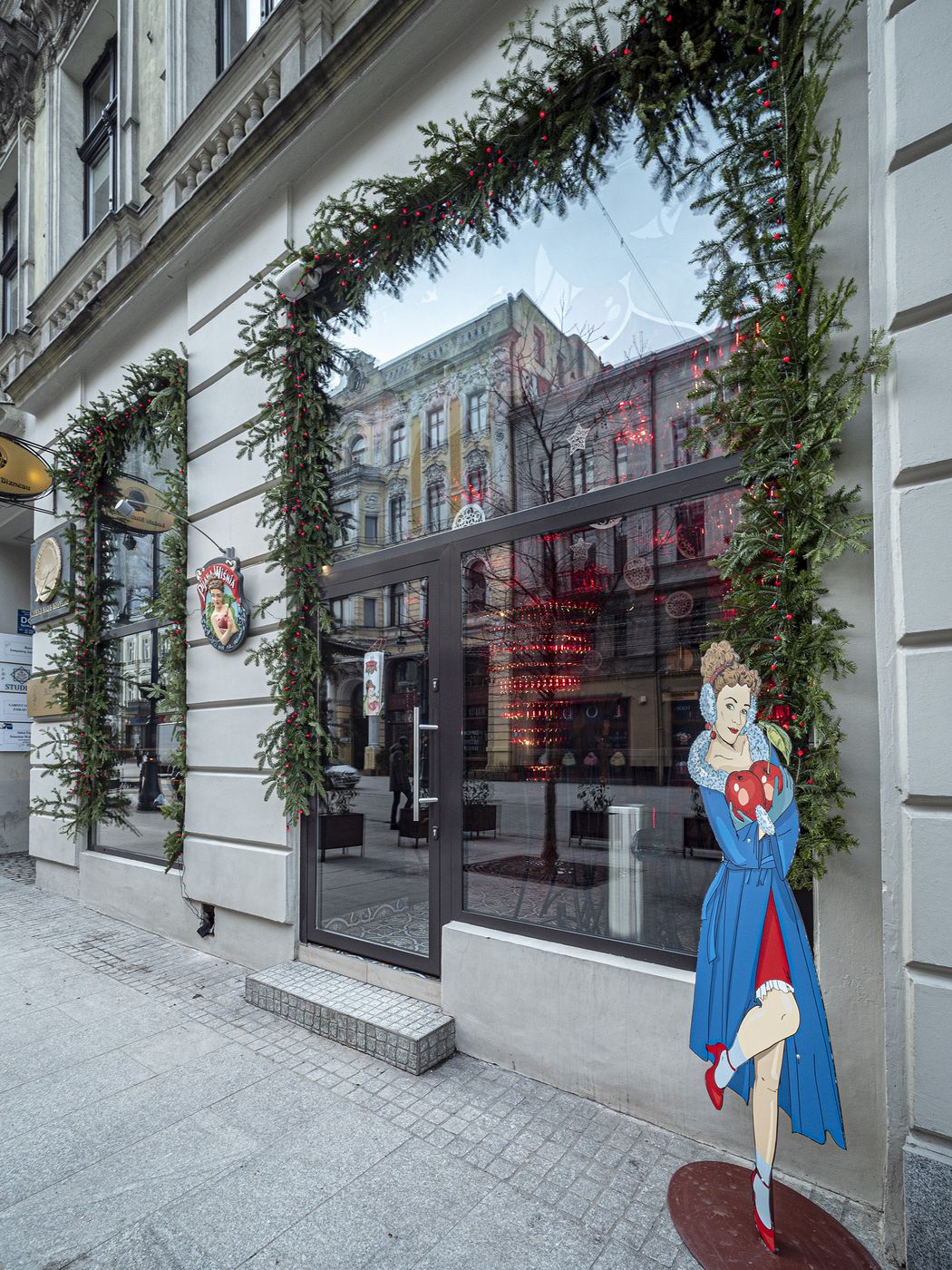 Ministerstwo Śledzia i Wódki, ul. Piotrkowska 111. Choinka przed wejściem, witryny przystrojone jodłowymi gałązkami, śnieżynki na szybach oraz napis Wesołych Świąt robią świąteczny klimat