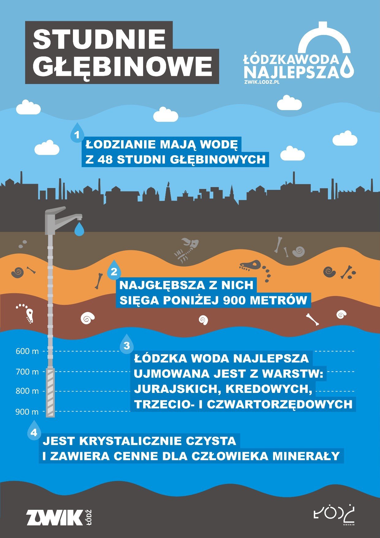Woda z najgłębszej łódzkiej studni trafia do zbiorników na Stokach, a stamtąd płynie do naszych domów. Pracownicy ZWIK dbają o stan techniczny ujęć głębinowych. Woda z nich jest systematycznie badana w laboratoriach. Przy użyciu kamery głębinowej monitorowany jest też stan techniczny otworów studziennych.