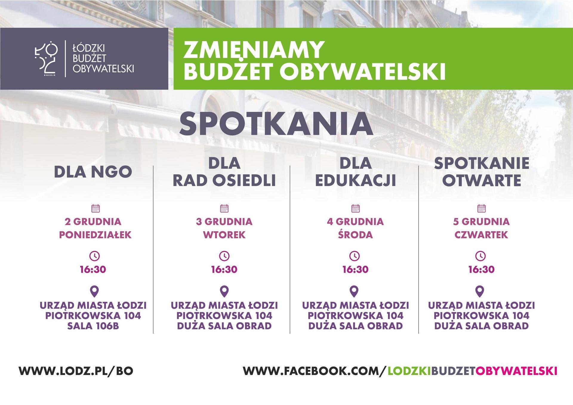 Spotkania odbędą się w Urzędzie Miasta przy Piotrkowskiej 104 o godz. 16.30. W poniedziałek 2 grudnia w Sali 106 B odbędzie się spotkanie dla NGO, we wtorek dla Rad Osiedli, we środę dla edukacji, a w czwartek dla wszystkich mieszkańców. Od wtorku do czwartku spotkania odbędą się w dużej sali obrad.