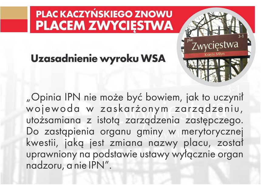 - Wojewódzki Sąd Administracyjny wskazał wiele czynników, które uzasadniają, że wojewoda nie mógł podjąć takiego rozstrzygnięcia zastępczego. W uzasadnieniu swojego wyroku sąd podkreśla, że opinia Instytutu Pamięci Narodowej nie może być bowiem, jak to uczynił wojewoda w zaskarżonym zarządzeniu, utożsamiana z istotą zarządzenia zastępczego. Do zastąpienia organu gminy w merytorycznej kwestii, jaką jest zmiana nazwy placu, został uprawniony na podstawie ustawy wyłącznie organ nadzoru, a nie IPN – mówił na konferencji prasowej radny PO Rafał Reszpondek.