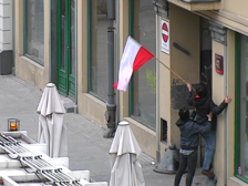 Dyżurny SM otrzymawszy od operatora informacje o zdarzeniu natychmiast skierował na miejsce funkcjonariuszy. Czujne oko kamery śledziło każdy krok mężczyzn, którzy kierowali się w kierunku Pl. Wolności. W międzyczasie mężczyźni zdjęli drugą flagę narodową. Dzięki rysopisowi patrol szybko ujął sprawców kradzieży, którymi okazali się 22-letni studenci, obywatele Hiszpanii. Sprawcy tłumaczyli, że chcieli mieć pamiątkę z Polski. Złodziei przewieziono do I Komisariatu Policji w Łodzi celem prowadzenia dalszych czynności.