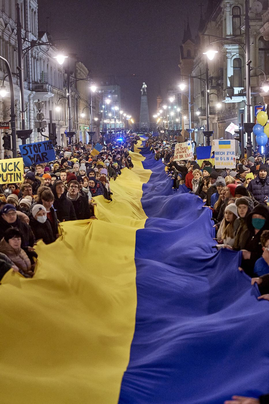 Marsz "Stop Wojnie!" na Piotrkowskiej. Łodzianie nieśli ogromną flagę Ukrainy [ZDJĘCIA, WIDEO]